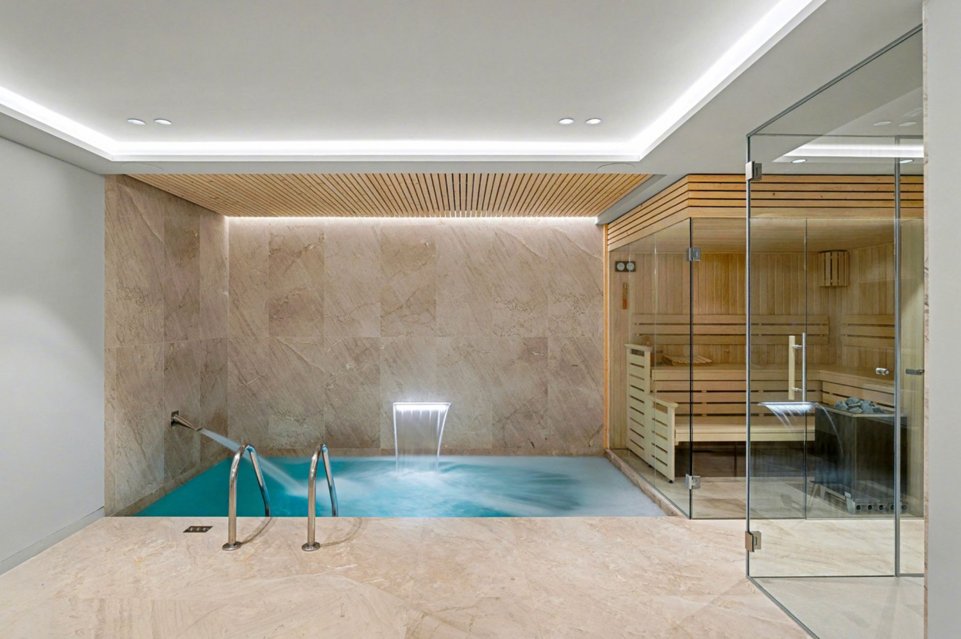 For wellness and fitness enthusiasts, the property offers a dedicated wellness level, featuring a Turkish sauna, a fully equipped gym with professional-grade TechnoGym machines, and a spa-like ambiance. This private area allows residents to relax, recharge, and maintain a healthy lifestyle from the comfort of their own home. Additional modern features include under-floor heating, advanced KNX smart home technology, air conditioning, and lift access, combining comfort, convenience, and cutting-edge home automation.