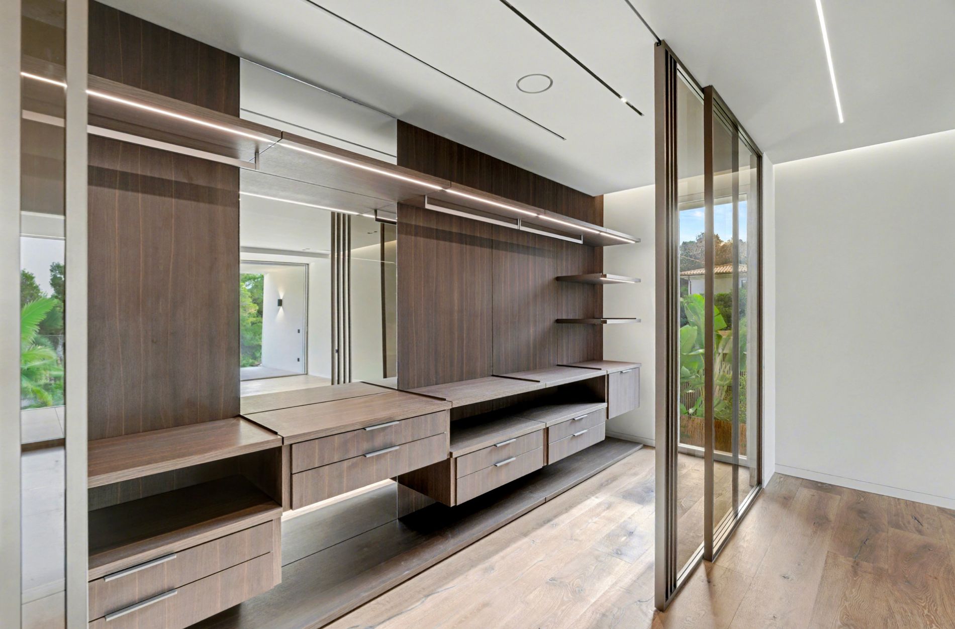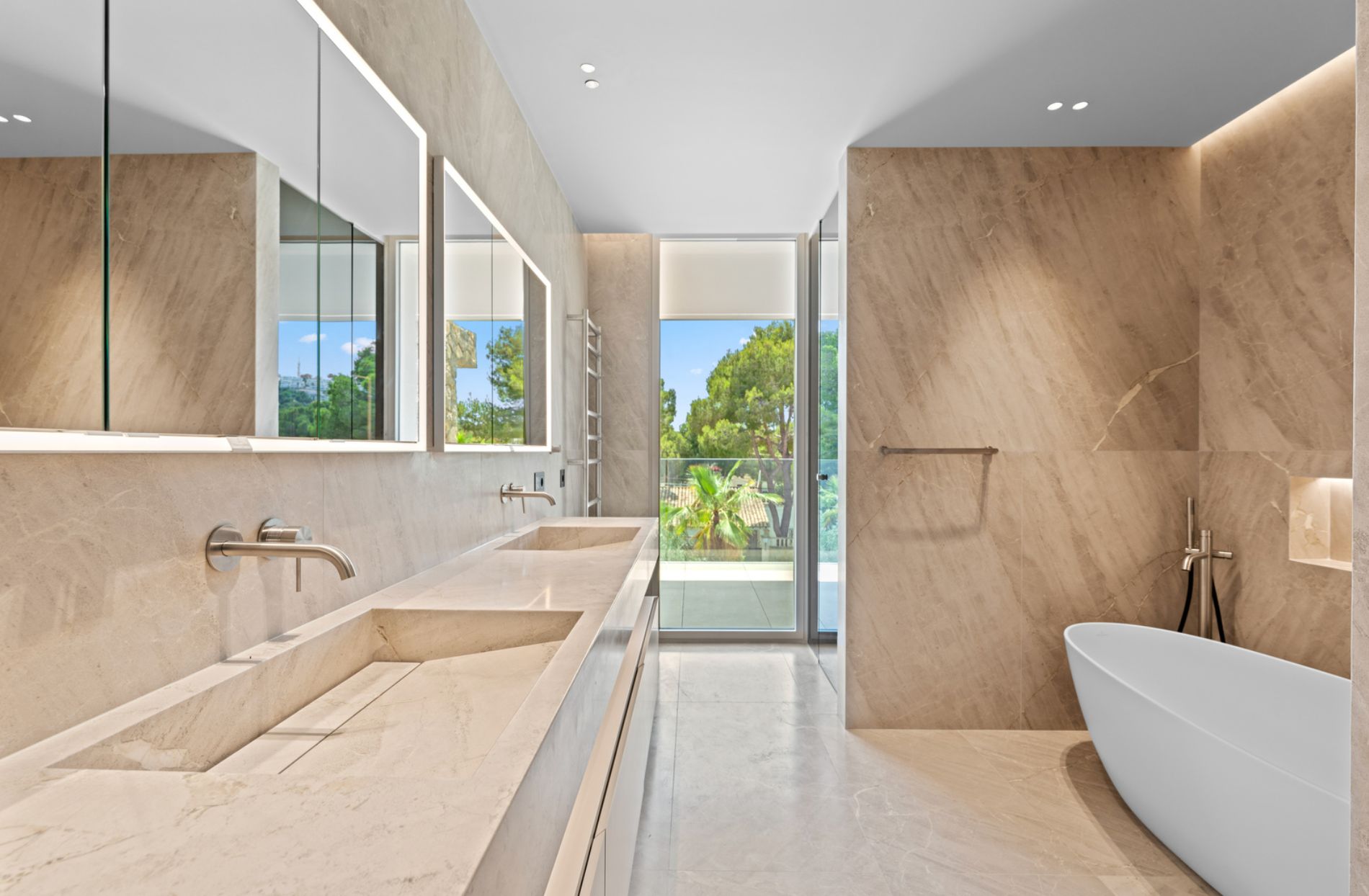 Villa is finished with high-end materials, including Mallorcan stone, porcelain stoneware and ZARCI grey-stone basins. An advanced KNX smart home system allows full control of lighting, temperature, blinds and security from anywhere in the world. Underfloor heating ensures comfort throughout all seasons.